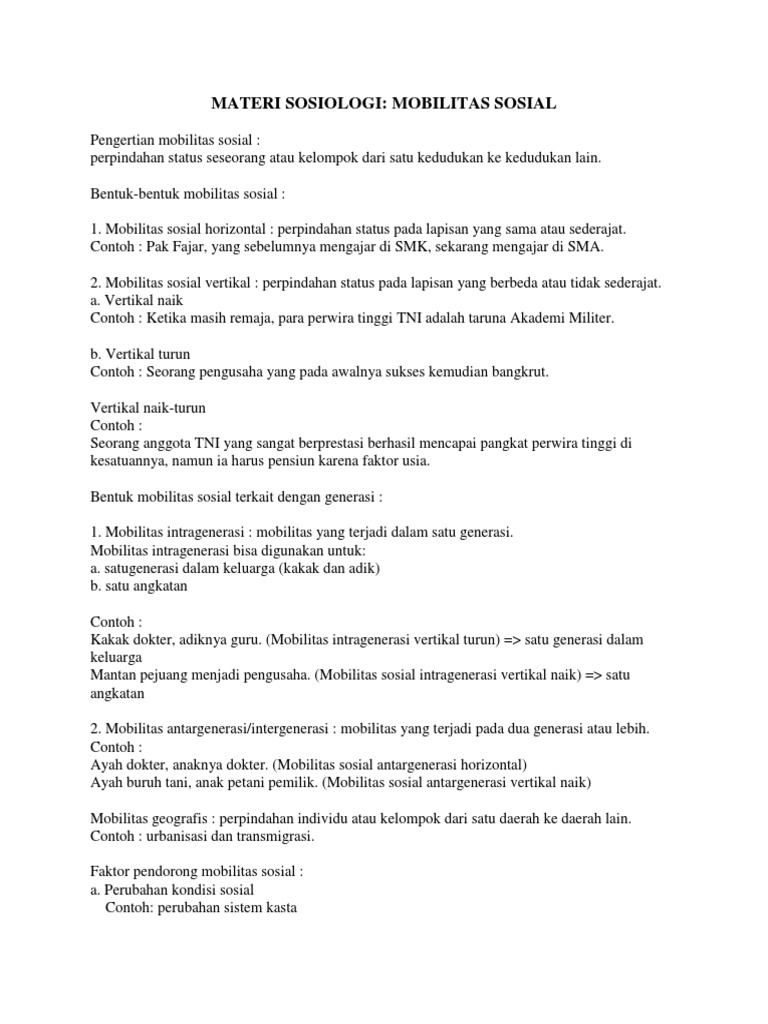 Contoh mobilitas antargenerasi ini yaitu ada seorang ibu. Apa sajakah bentuk mobilitas sosial dan contohnya? Penyebab mobilitas sosial dalam keluarga petani suburban terdiri atas faktor individu dan struktur yang dapat mendorong dan menghambat. Mobilitas sosial intragenerasi ialah mobilitas sosial yang dialami oleh seseorang selama masa hidupnya atau perubahan status sosial mulai dari lahir sampai dengan masa tuanya. Mobilitas sosial antar wilayah/ geografis.